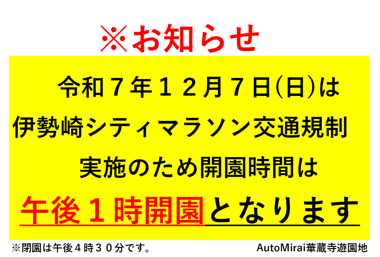 令和7年12月7日(日)第21回伊勢崎シティマラソン当日は、AutoMirai華蔵寺遊園地周辺では交通規制が実施されるため、 開園時間を午後1時からとさせていただきます。(閉園は午後4時30分です) ご理解ご協力をよろし […]