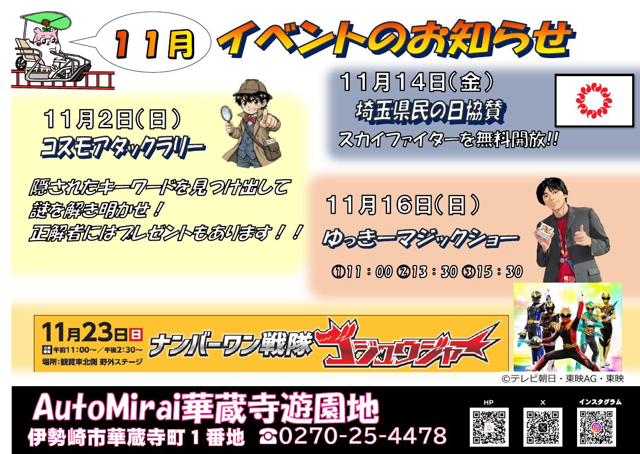 11月2日(日)コスモアタックラリー 隠されたキーワードを見つけ出して謎を解き明かせ! 正解者にはプレゼントもあります!! 11月14日(金)埼玉県民の日協賛 スカイファイター無料開放!! 11月16日(日)ゆっきーマジ […]